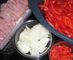Zuerst schneide ich das Putenfilet in mundgerechte Streifen und stelle es wieder in den Kühlschrank. Dann die Paprika waschen, entkernen und auch in Streifen schneiden und in den Varoma geben. Eine handvoll Paprika in kleine Würfel schneiden und in einem Schüsselchen aufheben. Zwiebel schälen und in feine Würfel schneiden.