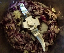 "Mixtopf geschlossen" geben und 5 Sekunden auf Stufe 5 zerkleinern. (Besser Knoblauchzehe zerdrück in den