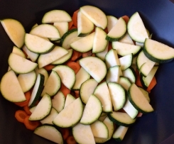 2. Zucchini und Paprika waschen. Paprika entkernen. Möhren schälen. Alles in kleine Stücke schneiden. (Bei den Möhren darauf achten, dass die Stücke nicht zu dick geschnitten sind.)