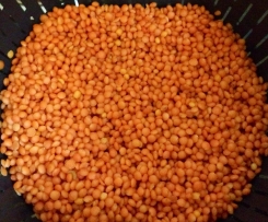3. Rote Linsen in den Gareinsatz geben und gut mit klarem Wasser spülen. (Anfangs schäumt es etwas, weiterspülen, bis der Schaum verschwunden ist)