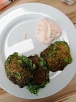 Mit meiner Tomatensauce (Salsa) servieren.Alternativ mit Tzatziki oder z.B. Frankforter Grie Sos (Frankfurter Grüne Sauce).