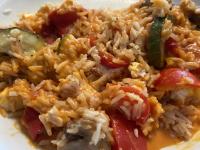 Es hat uns sehr gut geschmeckt. Ich hatte keine Zucchini da, aber ansonsten nach Rezept gearbeitet. Da ich 400 g frische Tomaten genommen habe, gab ich die bevor der Reis in den Topf kommt (also gleich nach den Zwiebel-Knobi-Andünsten dazu und habe alles kurz pürriert. Dann den Reis dazu und nach Rezept weiter. Alles war super lecker, hat auch meinen Männern geschmeckt. Wir machten zusätzlich in der Zeit, als der Reis dünstete Gyrosfleisch in der Pfanne dazu und ein Zaziki. Das machen wir wieder. DANKE