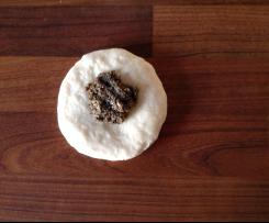 " Modus „Teig kneten“" kneten. Bei Bedarf noch Mehl hinzufügen. Der Teig darf nicht klebrig sein. Danach den Teig 10 min. ruhen lassen. - Den Teig in 14 kleine Stücke teilen. Diese ausrollen und jeweils 1-2 TL Füllung in die Mitte der Teiglinge verteilen.