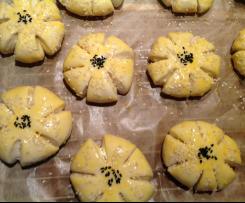 - Die Teiglinge mit Eigelb bestreichen und mit Sesam und Schwarzkümmel bestreuen. Im vorgeheizten Backofen ca. 20/25 min./180°C goldbraun backen.