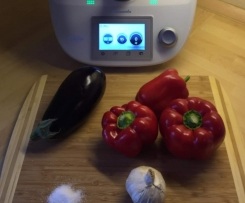 "Mixtopf geschlossen" geben und 5 sec Stufe 8 pürieren Aubergine hinzugeben und nochmals 5 sec Stufe 7 pürierenEssig, Wasser, Öl, Salz und Zucker hinzugeben. Garkorb als Spritzschutz auf den Deckel stellen und 20 min bei 100 Grad garen.
