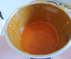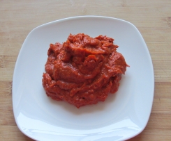 "Mixtopf geschlossen" geben und 10 sek./Stufe 4 verrühren. Falls nötig noch Wasser dazugeben, so dass es nicht zu dick und nicht zu dünn ist. - Gewicht der Masse ermitteln und entsprechend Gelierzucker dazugeben und 10 sek./Stufe 10 mischen.
