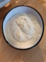 Wenn die Soße/ Dip zu fest ist kann auch noch ein wenig Schlagsahne untermischen bis gewünschte Konsistenz gegeben ist.