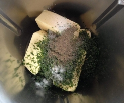 Ich nehme immer nur 125g Butter damit die Kräuterbutter immer frisch ist (sie ist ja flugs wieder nachgemacht). Dafür nehme ich 10g TK 8 Kräuter, 1/2 TL Salz und statt Knoblauch etwas getrocknete Knoblauch-Petersilienmischung (Ajo y Perejil) aus Spanien. Mit Pfeffer bin ich eher vorsichtig.