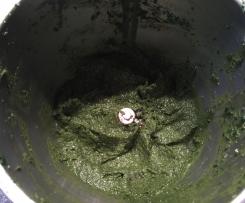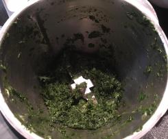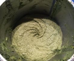 "Mixtopf geschlossen" geben, Messbecher aufsetzen und 20 Sek./Stufe 7 pürieren. Die Masse mit dem Spatel hinunterschieben. - Kürbiskernmus hinzufügen, Messbecher aufsetzen und 1 Min./Stufe 8 unterrühren (jetzt wird die Kräuterbuttercreme etwas zäh, besonders wenn das Kürbiskernmus vorher im Kühlschrank gestanden hat). Die Masse mit dem Spatel hinunterschieben.