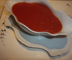 geben und bei 3 Sek ./ Stufe 5 ./hacken und dann 4 Min ./ Stufe 1./ 100 Grad ./ .Dann das Wasser ,Tomaten-passierte und Tomaten ,Salz und gemahlene Cayennepulver hinzufügen in