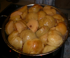 Die Quitten mit einem trockenem Tuch vom weißen Flaum befreien, in grobe Stücke schneiden und dabei den Stiel- und Blütenansatz entfernen. Die Stücke gleich in das Zitronenwasser geben und bei Bedarf Wasser auffüllen, so das die Quitten leicht bedeckt sind.