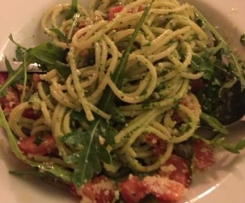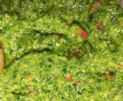 Das Pesto entweder gleich servieren oder in Gläschen füllen. Beim Servieren noch einen kleinen Schöpfer Nudelwasser zugeben.