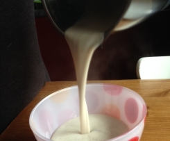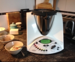 "Sanftrührstufe" Stufe 1, zwischendurch mal 5 sec Stufe 5 drehen. - Nun kurz die 50g Milch und die 10g (oder mehr, nach Gusto) abwiegen. Weiter mit 5 Min / 100C°/