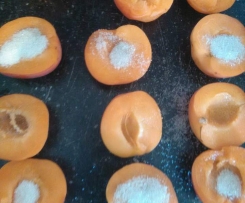 Während der Teig abkühlt, einen Topf mit Wasser zum Kochen bringen, die Aprikosen teilen, entsteinen und jeweils ins "Kernhaus" von der Zimt/Zuckermischung einfüllen.