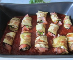 Dann die Soße in eine Auflaufform füllen, die Röllchen darauf setzen und bei 180°ca. 30 Min. backen.