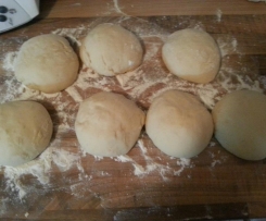 In eine Rührschüssel legen und für ca. 45 min. bei 35°C im Ofen (Umluft) gehen lassen.Wenn sich die Masse verdoppelt hat 7 bis 8 Kugeln formen auf eine mit Mehl besäubte Arbeitsfläche legen, abdecken und noch einmal 10 Min. gehen lassen.