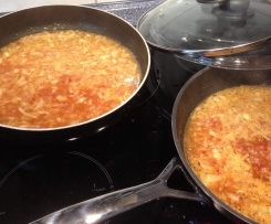 Nun mit einem Schuß Sonnenblumenöl beide Pfannen erhitzen und die Zwiebeln schön glasig anbraten. Dann mit je 250ml Wasser ablöschen und mit dem Tomatenmark, der Brühe, Salz und Pfeffer würzen. Den Sud bitte abschmecken und Vorsicht mit dem Salz, der Schinken ist ja schon salzhaltig.