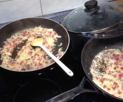 In der Zwischenzeit stelle ich zwei Pfannen auf den Herd und befülle beide mit je einer klein geschnittenen Zwiebel, einer Knolauchzehe kleingeschnitten und einer Packung Kartenschinken.