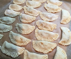 5. Teig dünn ausrollen (Untergrund bemehlen). Mit einem Glas dicht an dicht Kreise ausstechen (ca 7 cm). Auf jeden Kreis seitlich einen TL der Füllung geben, Ränder leicht anfeuchten und zuklappen. Mit einer Gabel die Ränder fest verschließen.