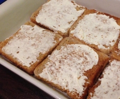 Die Hälfte der Toastscheiben, mit der Frischkäseseite nach oben, in eine Auflaufform legen.