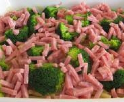 Auflaufform ein wenig ausfetten. Die Hälfte der Nudeln hinein geben. Nun den Brokkoli drauf schichten und darauf den gek. Schinken. Nun folgen die restlichen Nudeln.