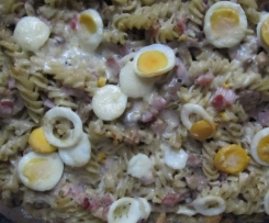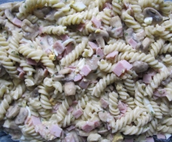 Sieht sehr lecker aus. Hatte nicht soviel Pilze, aber noch Lauch und statt des Schinken hab ich Cabanossi genommen. Freu mich schon aufs Essen