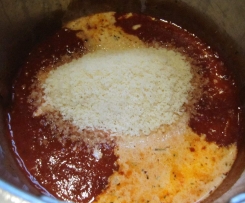 Die (Kaffee-)Sahne und 50 g des geriebenen Parmesans zu der Tomatensoße in den