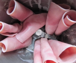 Kochschinkenscheiben aufrollen und hochkant zwischen die Messerklingen stellen.