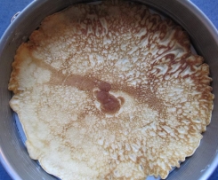 Einen Pfannkuchen in die Springform legen (ich habe für ganz unten und ganz oben die größten Pfannkuchen genommen).