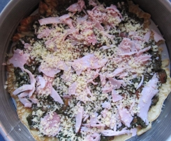 Jeweils 1/5 der Tomaten-Spinat-Mischung und des Kochschinkens sowie 1/6 des Käses darüber geben (es kommt nicht so genau drauf an