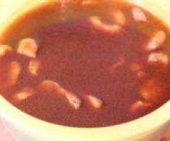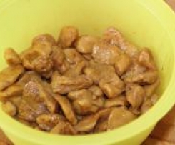 Mit dem durchgesiebten Sud begießen, so daß die Seitanstücke mit dem Sud bedeckt sind. Den restlichen Sud kann man sehr gut zum Herstellen und verfeinern von Soßen verwenden. z.B. um Seitan-Gulasch herzustellen.