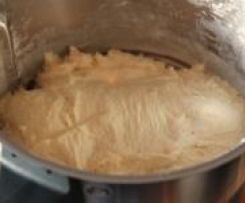 " Modus „Teig kneten“" einstellen und starten. Das Mehl nach und nach durch die Deckelöffnung zugeben, so daß sich keine Klumpen im Teig bilden. Das Zugeben des Mehls sollte 3-4 Minuten beanspruchen. Während der Restzeit wird der Teig schön glatt geknetet.