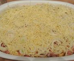 Zwiebelringe oben drauf verteilen und dann den geriebenen Käse darüber streuen.