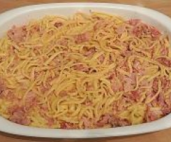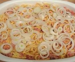 Statt Zwiebeln hab ich Lauch und Karotten vorab angedünstet und über die Spatzen gegeben, Sauce etwas entschärft (Hälfte der Sahne durch Schmand ersetzt), vegetarisch gelassen.... Kasemischung aus Emmentaler und Bergkäse verwendet. Mit 400g Spatzen war die Sauce genau richtig, nix trocken und geschmacklich zum Reinlegen