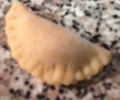 Die Kreise zu Taschen zusammenklappen, den Rand andrücken und dann mit einer Gabel zusammendrücken. Dann halten die Taschen und es gibt auch noch ein schönes Muster.