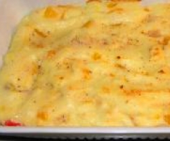 Alles in eine Auflaufform füllen, mit Butterflocken belegen und bei 175°C backen, bis er goldbraun ist (ca. 15 Minuten).