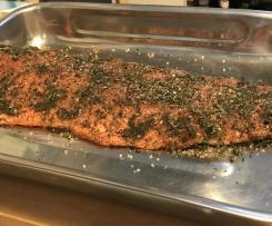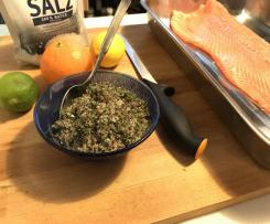 Hälfte des Gewürz auf den Boden verteilen und den Lachs drauflegen, etwas fest drücken. Restlichen Gewürze drüber verstreuen und andrücken.