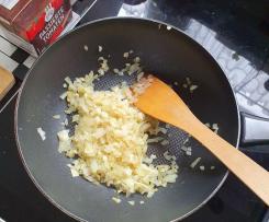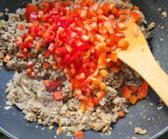 - Paprika in kleine Würfel schneiden (oder wer es möchte kann sie auch im Thermomix zerkleinern), ebenfalls in die Pfanne geben und alles gut vermischen.