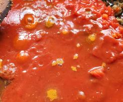 - Die passierten Tomaten ebenfalls zufügen und wieder alles gut vermischen. Wenn man viel Soße möchte kann man optional 1 Dose gehackte Tomaten zufügen.