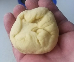 Nun den Teig aus der Schüssel holen mit Mehl bestäuben und ein wenig kneten .