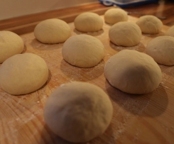 Teigstücke abstechen, auf der gemehlten Arbeitsfläche leicht flach drücken und die Ränder nach innen falten (ähnlich wie beim Brot). Dann zwischen den Handflächen rund rollen bis die dampfnudeltypische Form entstanden ist. Mit der Fläche, die beim Falten oben war, jetzt nach unten auf die bemehlte Arbeitsfläche setzen. Mit Geschirrhandtuch abgedeckt nochmals eine halbe Stunde gehen lassen. - 2. Dampfnudeln braten