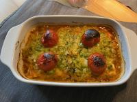Weil wir zu fünft sind, habe ich doppelte Menge gemacht, die Kochzeit der Soße auch verdoppelt und die Zeit im Backofen um 10 Minuten verlängert.