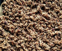 7. Nun bei 180 Grad ca. 15-20 Minuten backen. Bitte haltet immer wieder Sichtkontakt - nicht, dass Euch das Müsli verbrennt - jeder Ofen ist anders! Die Müsli-Mischung bleibt bis zum gewünschten Bräunungsgrad im Ofen - dann herausholen und ganz wichtig: Abkühlen lassen! Anschließend mit eine Gabel grob zerteilen und zur Aufbewahrung luftdicht verschließen.
