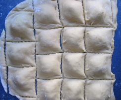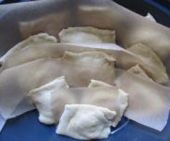 Die Zwischenräume wie ein Gitter mit Eiweiß bepinseln. Die 2. Teighälfte über die andere Hälfte legen, die Zwischenräume andrücken und die Piroggen ausrädeln oder -schneiden. Man kann natürlich auch aus dem Teig 7-8 cm große Kreise ausstechen, diese mit einem guten TL Sauerkrautmasse belegen und mit Hilfe von Eiweiß zu einem Halbkreis "verkleben".