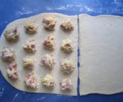 Teig (nach der Ruhezeit) auf g u t bemehlter Arbeitsfläche dünn in rechteckiger Form ausrollen, ca. 70 x 30 cm, und halbieren. Sauerkrautmasse teelöffelweise auf einer Hälfte verteilen. Dabei das Lorbeerblatt, die Nelken und Wacholderbeeren entfernen.