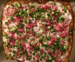 Man kann den Belag natürlich variieren, ich nehme auch gerne Creme fraîche, Rinderhack, Speckwürfel und Feta.