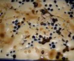 "Linkslauf" / Stufe 4 vorsichtig unterrühren. Den Teig in die Reine (Auflaufform) gießen und mit den Heidelbeeren belegen.Die Auflaufform in den vorgeheizten Backofen schieben und 10 Min. backen. In dieser Zeit den Guss zubereiten: Butter, Zucker & Zimt - 2,5 Min. / 90° / Stufe 2 und dann über den Teig gießen. Weitere 10 - 20 Minuten bis zur gewünschten Bräune backen.