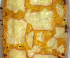 2. Schicht: Lasagneblätter, Kürbissoße, Hackfleischsoße, Käse gerieben