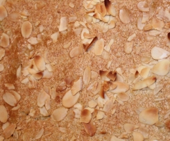 Rhabarber in eine Auflaufform geben, den Grießbrei darüber verteilen. Wer mag kann eine weitere Einschneeschicht über die Masse verteilen. Mit Mandelblättchen bestreuen.