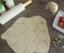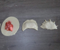 5. Teig am rand schön fest verschliesen (sonst öffnen sie sich beim kochen ) und kleine falten den rand entlang machen.